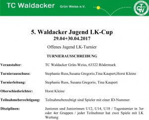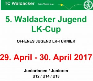 Nach den Erfolgen der LK-Cups der letzten beiden Jahre wird der TC Waldacker auch in 2017 wieder ein Turnier (das fünfte) durchführen. Geplant ist es vom 29. bis 30. April 2017. Das Jugendteam um Jugendwartin Stephanie Russ hofft erneut auf viele Teilnehmer, tolle Turniertage und gutes Wetter. Den Teilnehmern winken wieder Pokale und tolle Sachpreise.