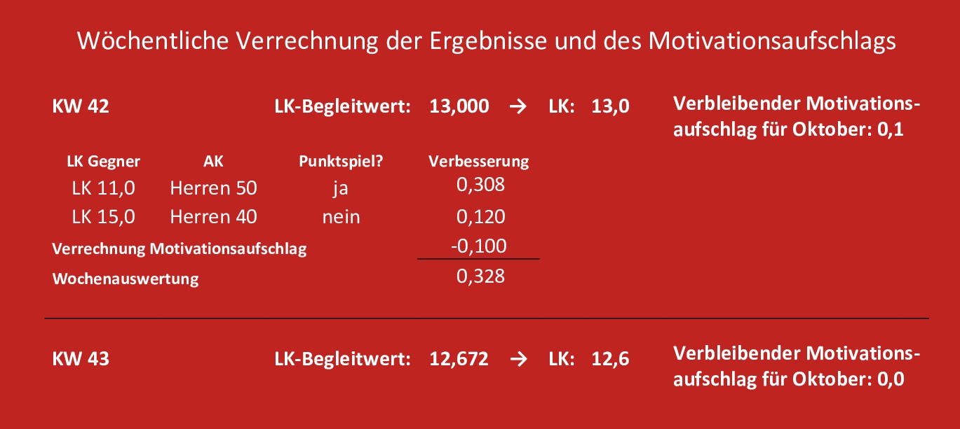 Auch Siege gegen LK-schwächere Gegner führen zukünftig zu einer stärkeren Verbesserung. Somit ist jedes Match wichtig und jeder Erfolg wertvoll.